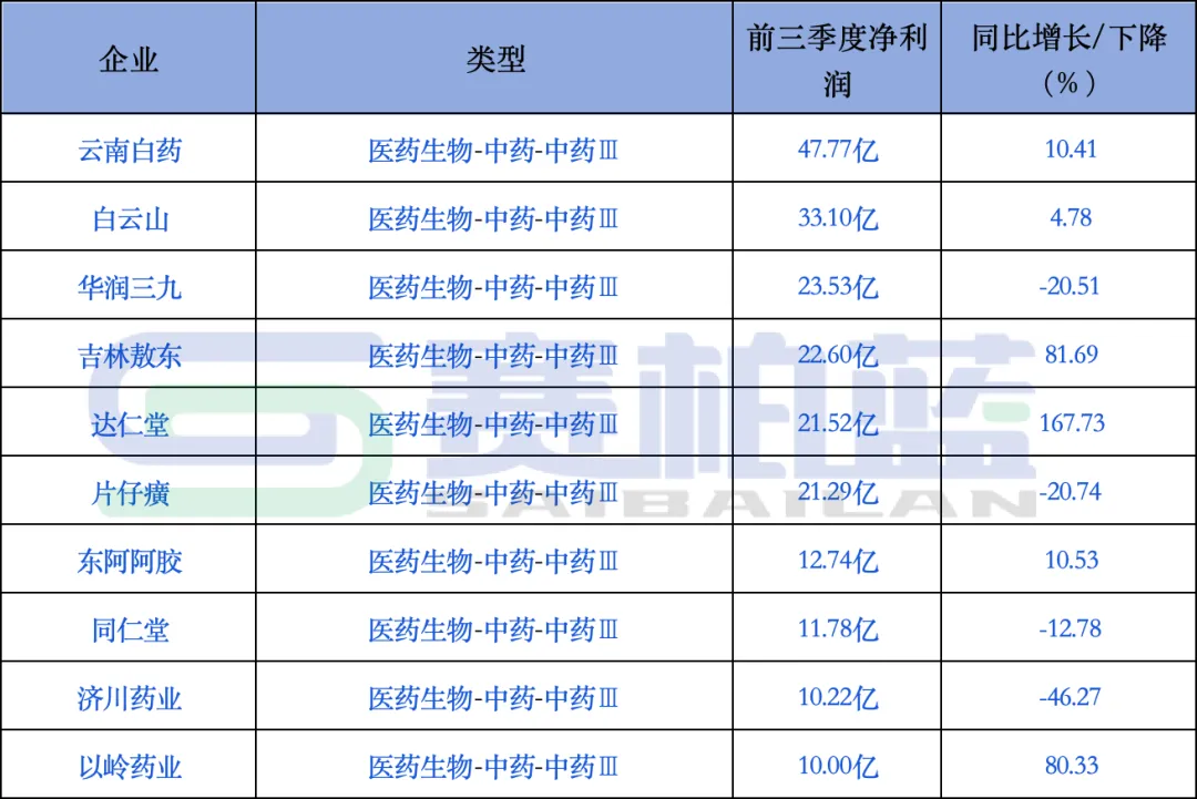 中药企业前三季度净利润排在前十的企业包括云南白药、白云山、华润三九、吉林敖东、达仁堂、片仔癀、东阿阿胶、同仁堂、济川药业、以岭药业。