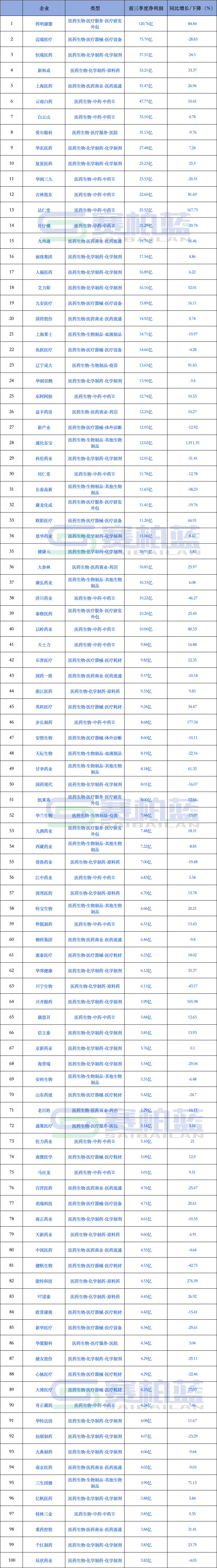 附:2025年前三季度净利润TOP100医药企业(制图:赛柏蓝;数据来源:同花顺问财)