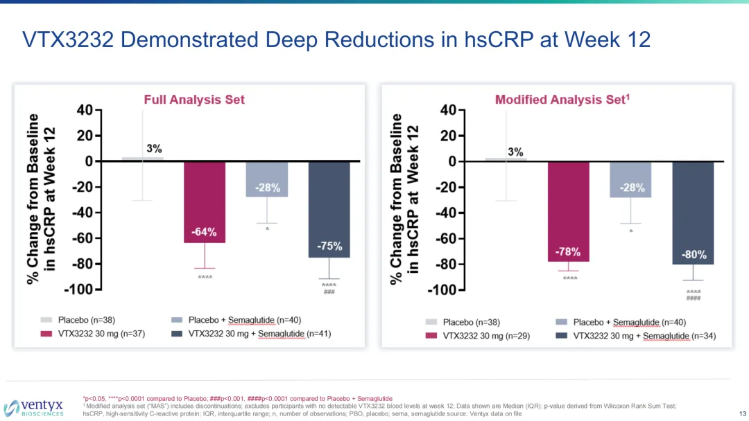 探索性终点值得一提还有IL-6水平的变化,与心血管风险之间存在显著的正相关性(高水平IL-6意味着血管壁正处于持续的炎性状态,可能加速动脉粥样硬化,增加严重心血管事件的风险)。VTX3232的II期研究显示其能够在维持免疫稳态的同时,将IL-6水平降低至心血管风险阈值以下。