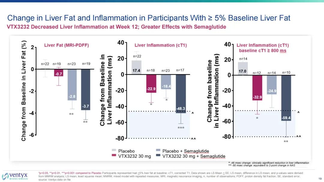 另外,在第12周时能够显著降低基线肝脏脂肪≥5%的受试者肝脏炎症,司美格鲁肽联用组疗效更佳。