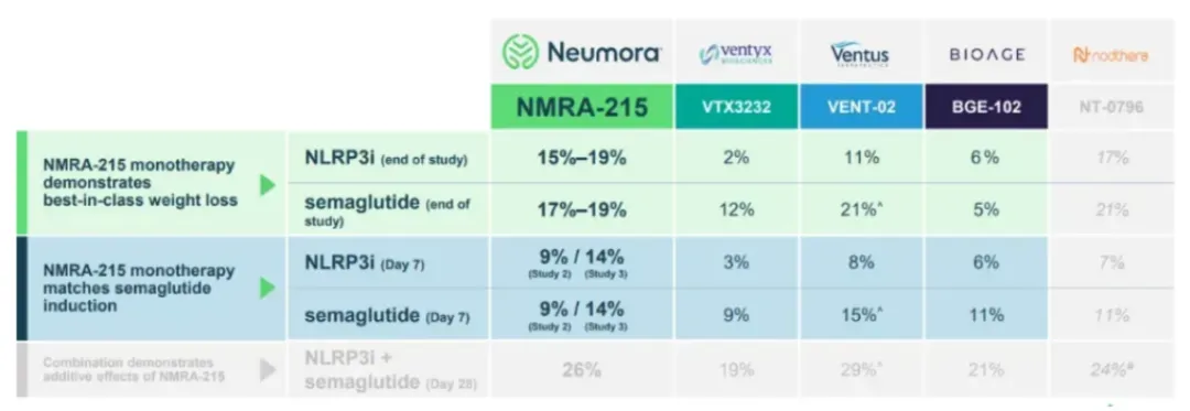 Neumora Therapeutics则是将NLRP3方向的开发重心放在减重领域,NMRA-215是公司号称BIC的NLRP3抑制剂,这种说法源自于NMRA-215的脑透性,NMRA-215的大脑渗透性几乎是VTX3232的三倍。