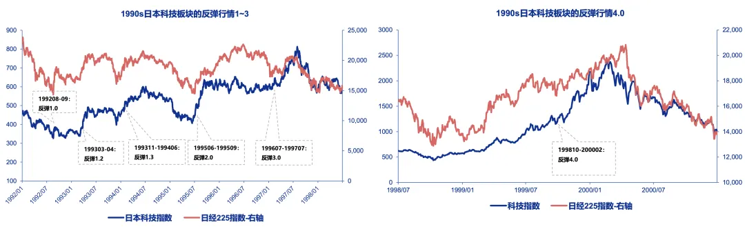 日本科技板块反复活跃,反复泡沫化。反弹1.0,在1992-1994年中历经3波行情,科技行业估值PE从最低32倍,上升到最高83倍;反弹2.0,科技行业估值PE从44倍提升至67倍;反弹3.0,科技行业估值PE从42倍提升至60倍;反弹4.0,受到科网泡沫影响,科技行业估值大幅提升,PE从29倍提升至413倍。