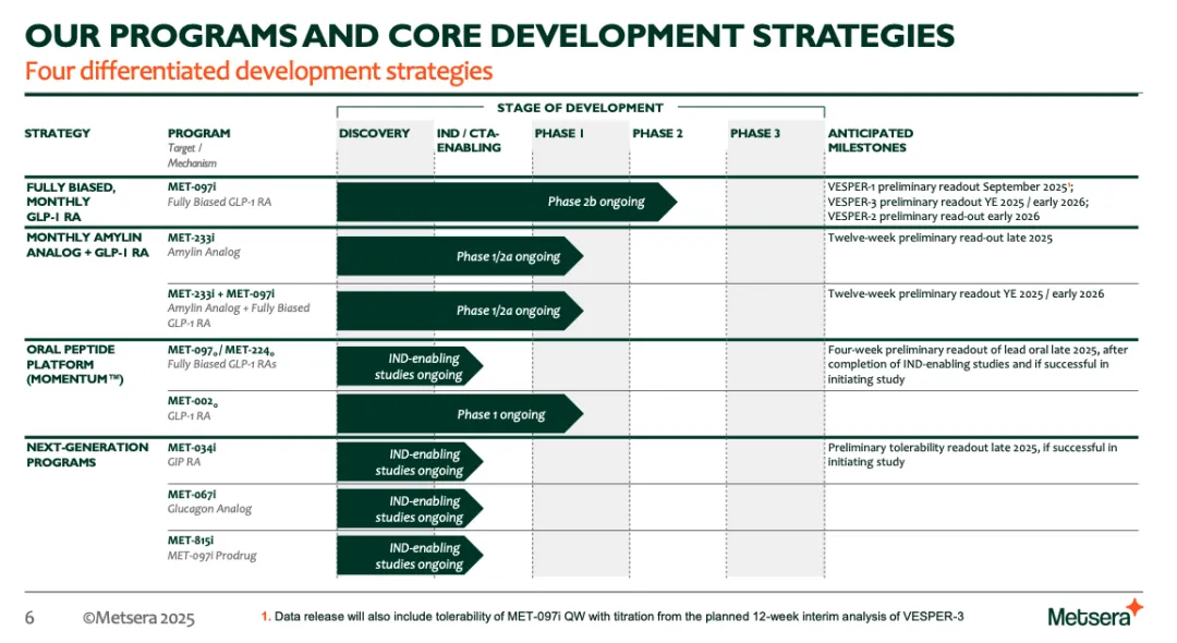 目前,Metsera 基于这些平台开发了多款减肥药管线,包括 MET-097i(每月注射一次的 GLP-1 受体激动剂)、MET-233i(每月一次超长效皮下注射型胰淀素类似物)、两款口服 GLP-1 激动剂(MET-002o 以及 MET-224o 和 MET-097o 的联合用药),以及多项处于临床前阶段的营养刺激激素疗法。