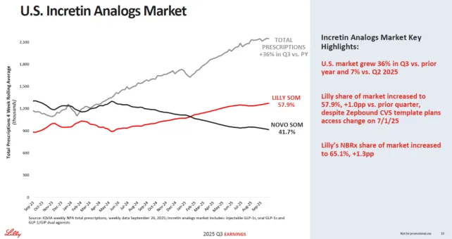 诺和诺德的 GLP-1 市场份额,已经被占据上风的礼来蚕食:截至 2025 年 9 月,礼来在美国市场占据了约 58% 的总处方份额,超过了诺和诺德(约 42%)。