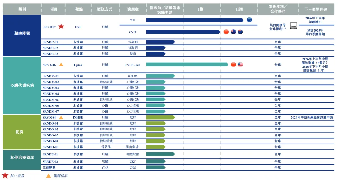 先看靖因药业,公司当前瞄准了凝血障碍、心脏代谢、肥胖三大治疗领域,其中两款管线已经进入临床二期,分别是与CRISPR达成合作的FXI siRNA管线SRSD107、Lp(a) siRNA管线SRSD216。