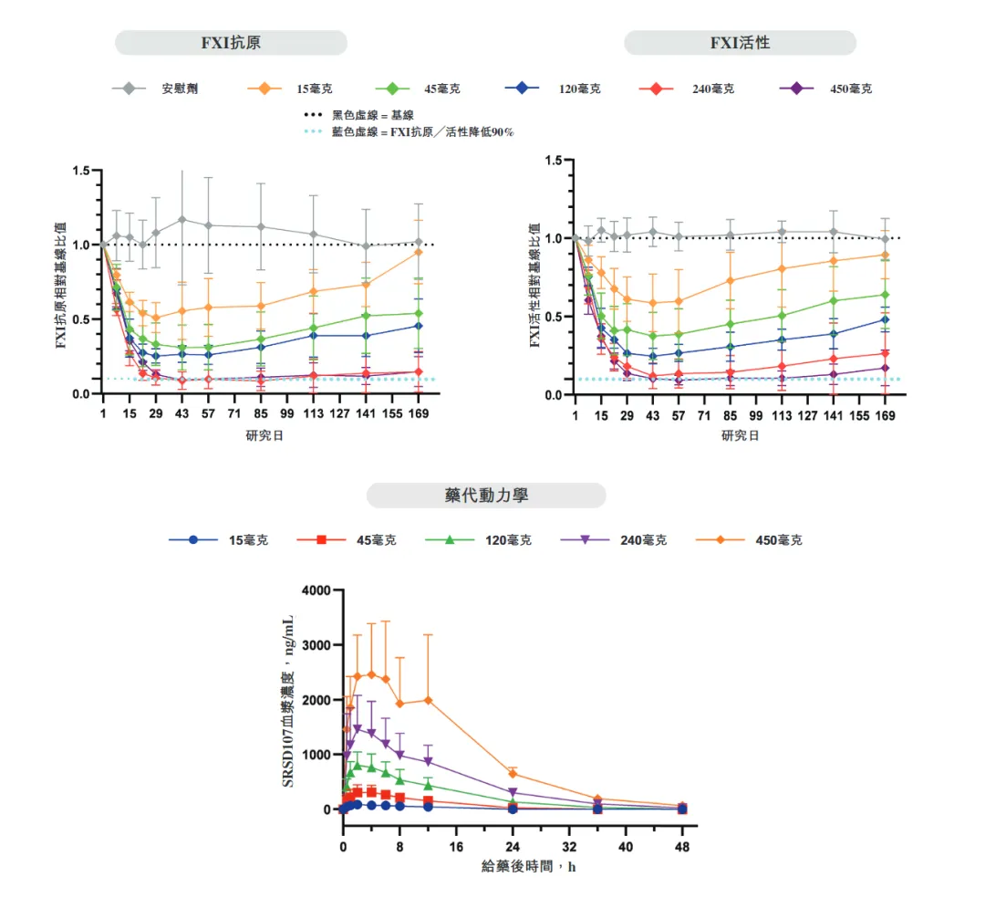 靖因药业SRSD107分别在澳大利亚和中国进行了两项健康人群临床,两项实验结果均显示SRSD107给药后患者FXI水准可持续抑制长达6个月,SRSD107在澳洲人群和中国人群分别实现了FXI水准最大降低93%和95%,并在给药6个月内均维持超过90%的抑制率。(另外,直接竞品FXI抗体Abelacimab过往临床数据显示,每月一次治疗,治疗三个月后患者的接受150 mg、90 mg剂量组的FXI抑制程度均超过95%。)
