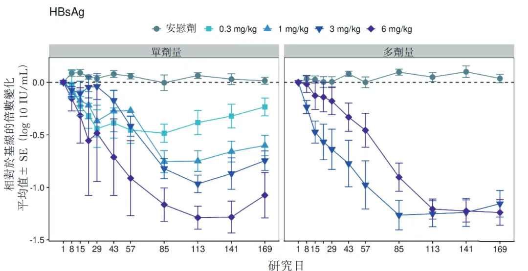以CHB的一期临床看,RBD1016展现了一定的治疗潜力,接受6 mg/kg剂量组的患者清HBsAg相對基線的平均最大降幅为1.29 IU/ml(血清HBsAg< 0.05 IU/ml一般视为转阴,是疗效核心指标)。
