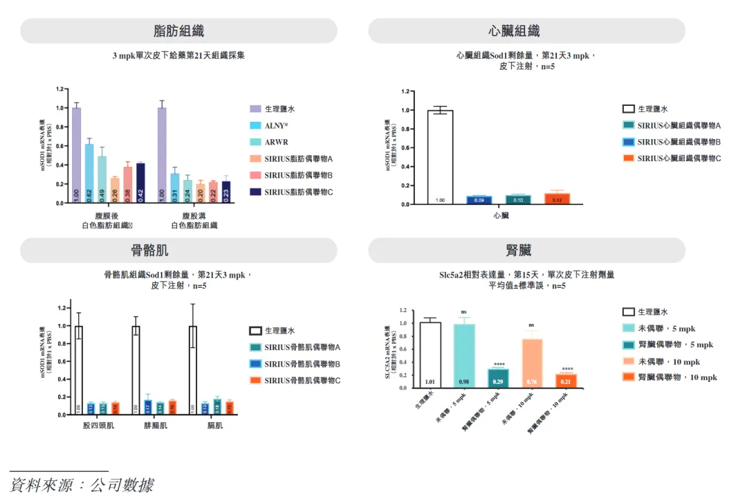 靖因药业同样在探索肝外递送技术的过程中,发现其肾脏偶联物在两种剂量(以单次5 mg/kg或10 mg/kg剂量皮下注射)水平下均呈现靶向效应,分別实现71%和79%的敲低。