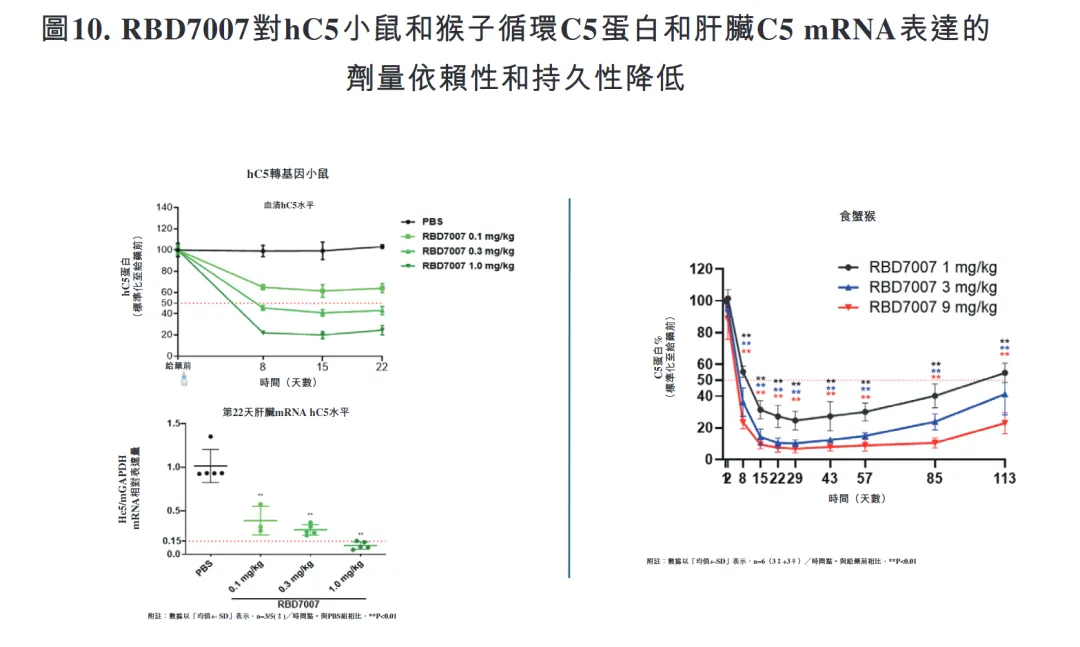 瑞博生物靶向C5的siRNA药物RBD7007更是在临床前数据展示出对循环C5蛋白水平和肝脏C5 mRNA表达的有效和持续抑制,具有很强的PK/PD相关性。