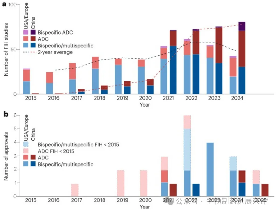 基于中国、美国或欧洲企业的增强型抗体疗法首次临床研究及全球获批趋势。a:增强型抗体首次人体(FIH)研究趋势n= 776)在2015–2024年期间进入临床研究的分子,按分子来源地区(美国或欧洲)分层n= 424;