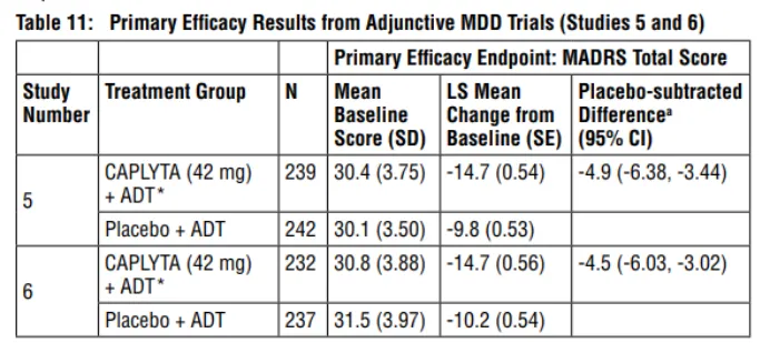 本次获批辅助治疗重度抑郁症,主要基于两项名为501和502的全球多中心、双盲、安慰剂对照Ⅲ期临床试验的积极结果。两项研究均达到主要终点和关键次要终点:与“抗抑郁药+安慰剂”相比,“抗抑郁药+Lumateperone”在蒙哥马利-阿斯伯格抑郁量表(MADRS)总分和临床总体印象量表-严重程度(CGI-S)总分上,均表现出具有统计学意义和临床意义的改善。