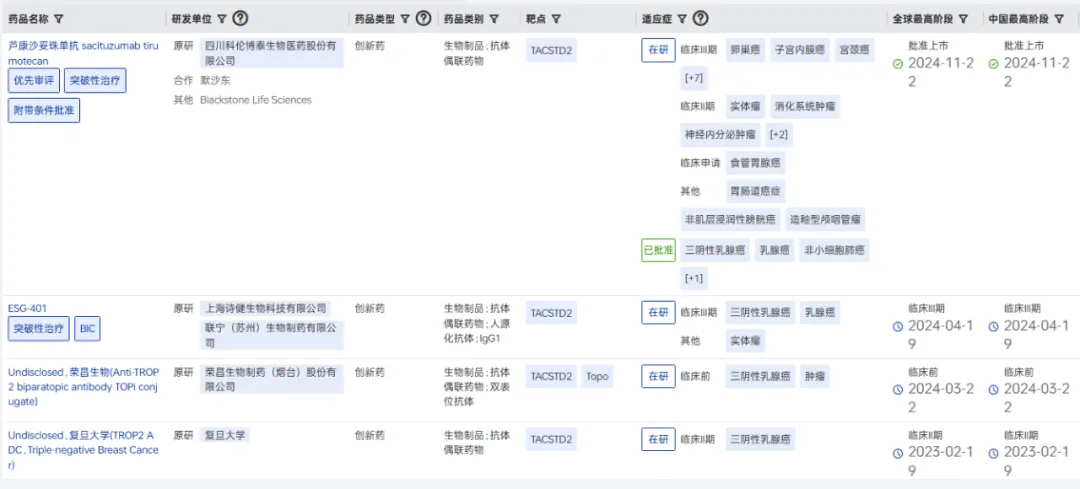 对于Trop2赛道,竞争才刚刚开始。药智数据显示,国内恒瑞医药、百利天恒、映恩生物的新一代Trop2 ADC已进入II期,它们在DAR值、连接子、payload上继续优化。Trodelvy的“溃败”,恰好为后来者让出了位置。