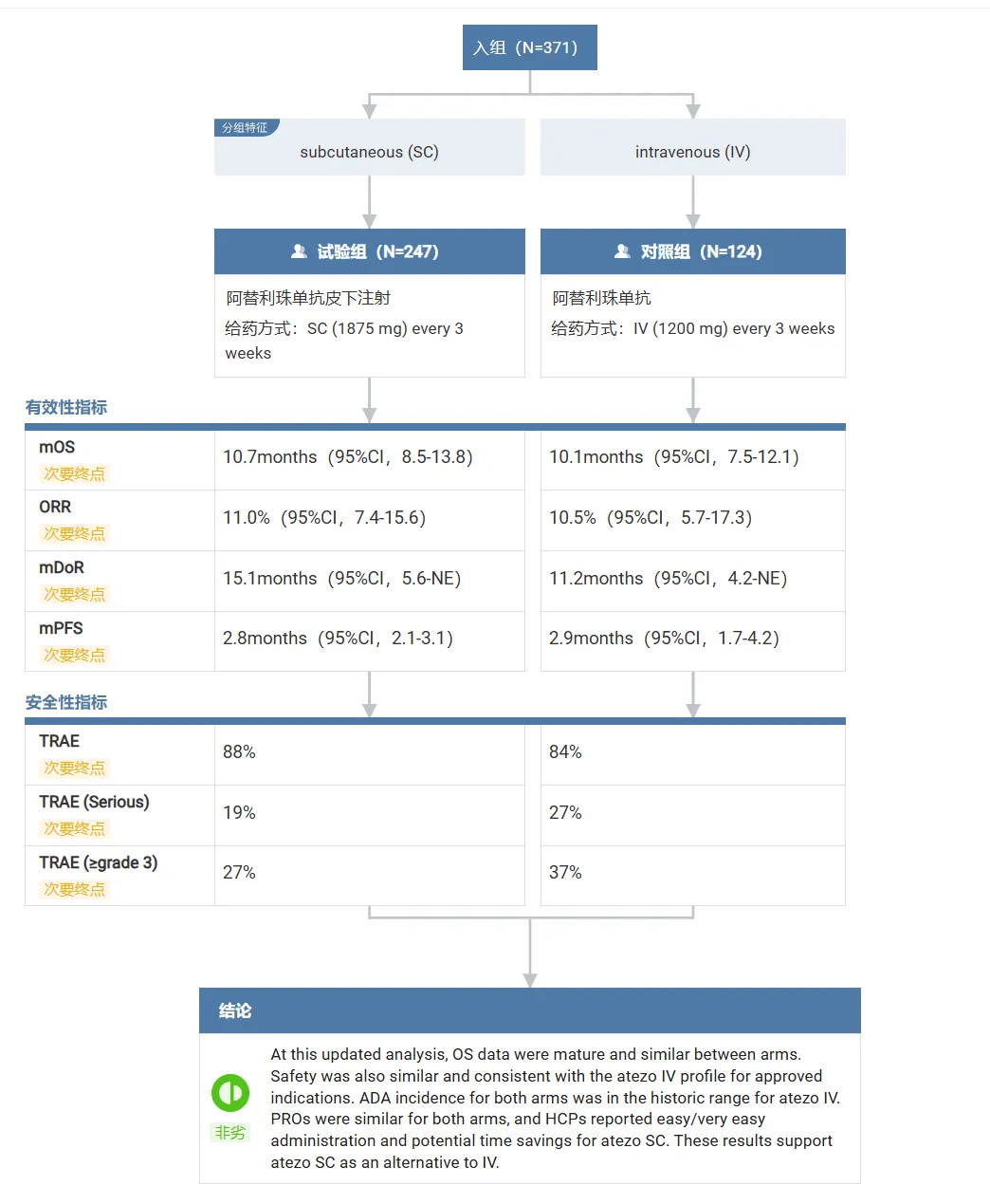 结果显示,阿替利珠单抗 SC vs IV 的疗效和安全性一致。两者中位无进展生存期(mPFS)分别为 2.8 个月和 2.9 个月,中位总生存期(mOS)分别为 10.7 个月和 10.1 个月,不良事件(AE)发生率相似,未发现新的安全性信号。