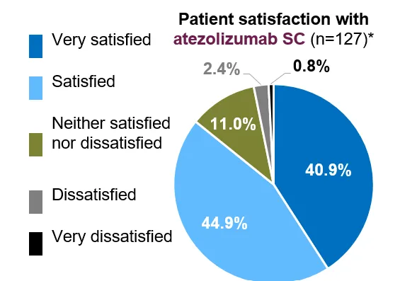 不仅如此,罗氏还曾开展研究探索患者对 SC 制剂和 IV 制剂的偏好度。IMscin002 研究纳入了 179 例患者,其结果显示,超过 70% 的患者倾向于选择阿替利珠单抗 SC;在满意度上,85.8% 的患者对 SC 满意。