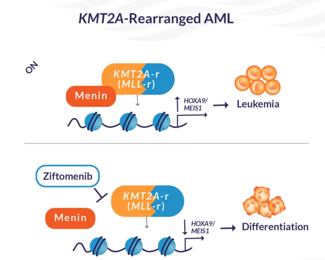 Menin 是一种调节蛋白,通常有助于血细胞分化;遗传畸变破坏了其正常活动,导致未成熟细胞不受控制地生长。Menin 抑制剂阻断异常活动,有助于恢复正常分化并帮助抑制白血病增殖。