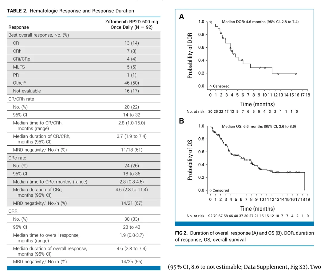 完全缓解率(CR)加 CR 伴部分血液学恢复率(CRh)为 21.4%(95%CI:14.2,30.2),横向高于历史复发NPM1-mAML的12%。CR+CRh 的中位持续时间为 5.0 个月(95% CI:1.9,8.1),达到 CR 或 CRh 的患者首次缓解的中位时间为 2.7 个月(范围:0.9-15 个月)。