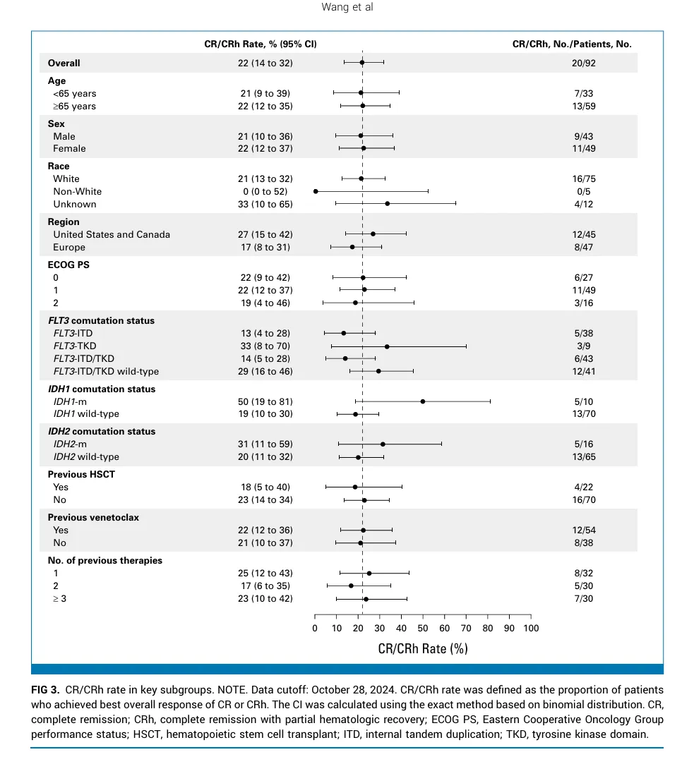 Results: From January 26, 2023, to May 13, 2024, 92 patients (median age, 69 years [range, 33-84]) were treated. The primary end point was met, with a CR/CRh rate of 22% (95% CI, 14 to 32; P = .0058); 61% were negative for measurable residual disease. Overall response rate was 33% (95% CI, 23 to 43), with a median duration of 4.6 months (95% CI, 2.8 to 7.4). Prespecified subgroup analyses showed comparable CR/CRh regardless of previous therapy, including venetoclax, or type of comutations. Median overall survival was 6.6 months (95% CI, 3.6 to 8.6). Common grade ≥3 treatment-emergent adverse events were febrile neutropenia (26%), anemia (20%), and thrombocytopenia (20%). Differentiation syndrome occurred in 25% of patients (15% grade 3; no grade 4-5) and was manageable with protocol-defined mitigation. Three patients (3%) discontinued treatment because of ziftomenib-related adverse events.