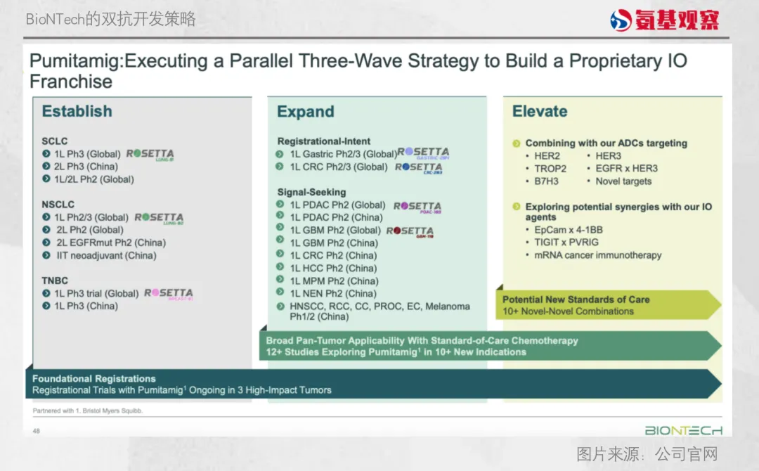 在最新的投资者会议上,BioNTech重申了“Establish、Expand、Elevate”三步走策略,并详细列出了临床试验列表。