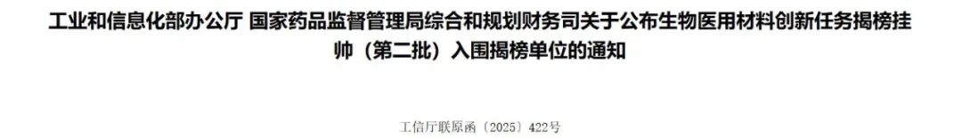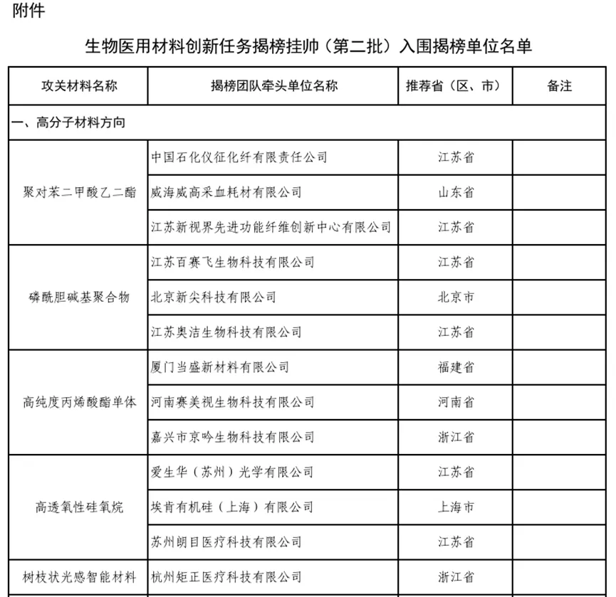近日,工业和信息化部、国家药品监督管理局联合公布第二批生物医用材料创新任务揭榜挂帅入围揭榜单位名单,围绕高分子材料、金属材料和无机非金属材料三大方向,共86家单位在35个材料类别的攻关中成功入围。此项目是国家工业和信息化部与国家药品监督管理局共同组织实施的国家级重大创新工程,旨在攻克生物医用材料领域“卡脖子”技术难题,加快我国生物医用材料的研发与应用进程,推动产业链上下游协同创新。该项目通过遴选具备关键攻关能力的创新主体,集中力量突破高端生物医用材料核心技术,打破对国外技术的依赖,推动实现自主可控与产业化应用,为我国医药产业高质量发展奠定坚实的材料基础。