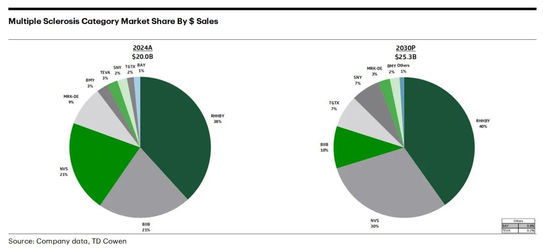 如下图所示,全球MS市场前三名分别为罗氏、渤健和诺华,前9位只出现了TG Therapeutics这一家Biotech。