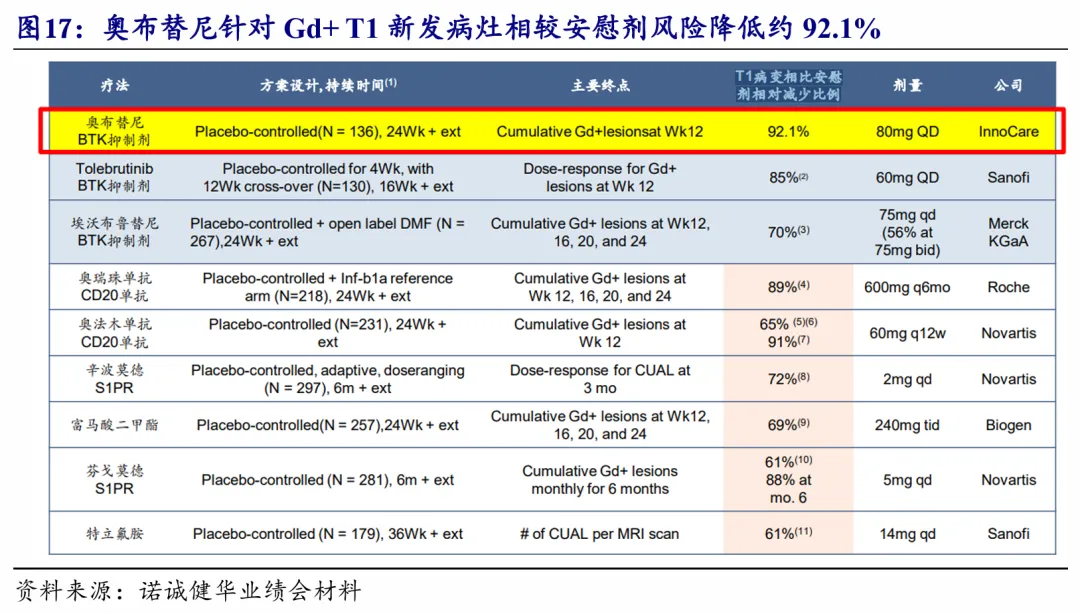 另外在Zenas合作伙伴的加持下,奥布替尼过往披露在RRMS的二期临床数据显得更为亮眼,在80mg治疗组针对Gd+T1新发病灶(活动性炎症的金标准,可提示新发病灶或复发期活动)相较安慰剂风险降低约92.1%,优于大多数竞品数据。
