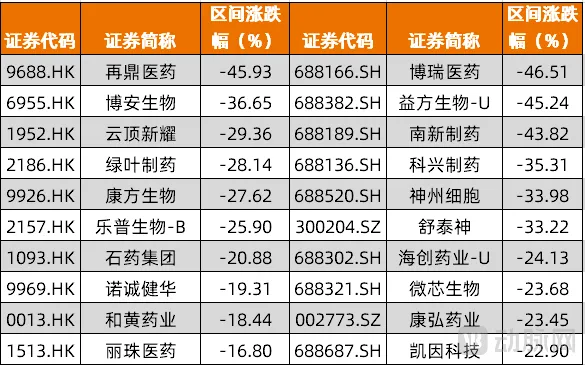 图1. 港股创新药指数成分股和A股创新药企跌幅居前的公司