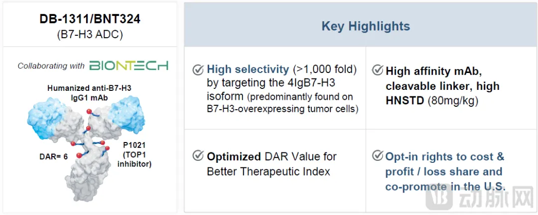 DB-1311是靶向B7-H3靶点的ADC药物。该产品采用人源化抗B7-H3 IgG1单抗,通过基于可裂解连接子与拓扑异构酶Ⅰ抑制剂载荷P1021连接,整体的设计思路和第一三共的DS-7300保持一致。