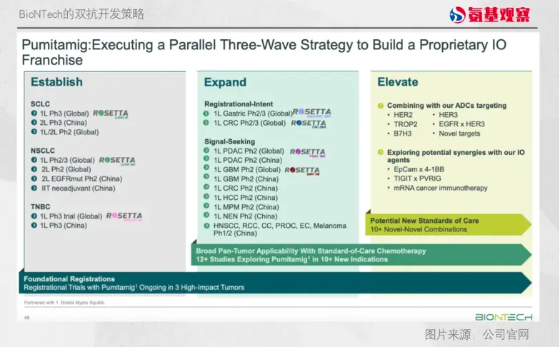 目前,BioNTech已推动Pumitamig20项临床落地,除了小细胞癌、NSCLC和三阴性乳腺癌的三期临床,更是加速推进泛癌种布局以及与化疗、ADC、新型免疫靶点药物(如PVRIG抑制剂BNT3213)等不同且新颖的联合疗法研究。
