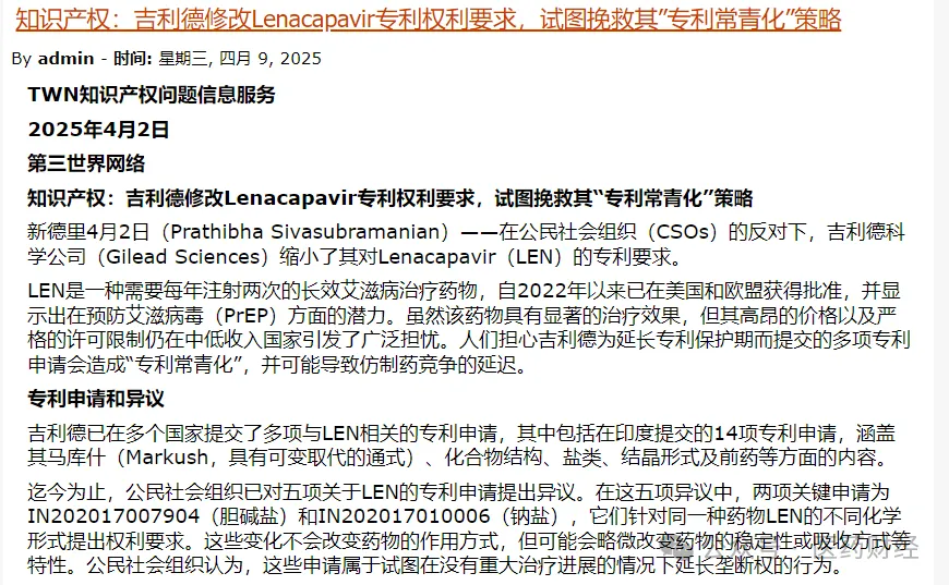 “专利常青化”策略:这是一种典型的策略,即在核心专利即将到期时,对药物进行微小的、非实质性的改动(例如制备新的盐、结晶形式或调整剂型),并为此申请新的专利。这试图在核心物质专利到期后,继续构筑垄断壁垒。比如吉利德公司为其艾滋病药物Lenacapavir所做的那样,尽管其核心化合物已在先申请中披露,但仍在印度提交了多达14项涉及盐类、结晶形式等专利申请。这种行为在印度等地会受到严格审查,印度专利法第3(d)条就明确,禁止为已知物质的新形式授予专利,除非其功效有显著增强。