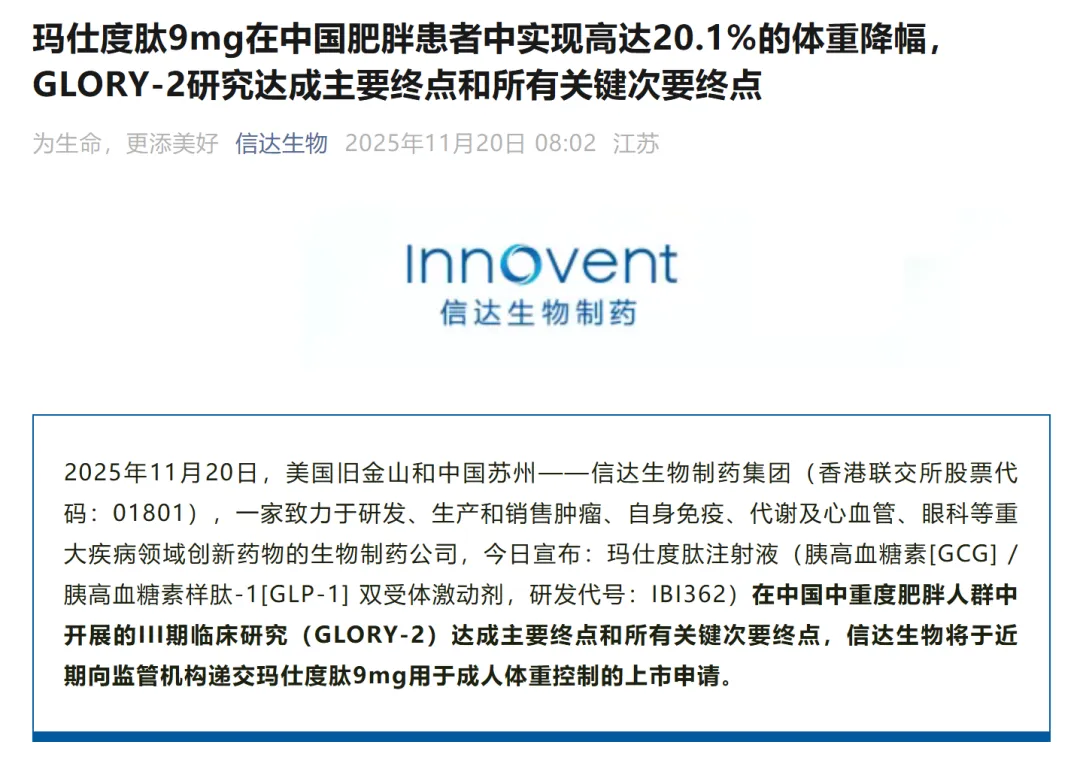 11月20日,信达生物宣布玛仕度肽(IBI362)在中国中重度肥胖人群中开展的III期临床研究(GLORY-2)达成主要终点和所有关键次要终点。信达生物将于近期向监管机构递交玛仕度肽9mg用于成人体重控制的上市申请。