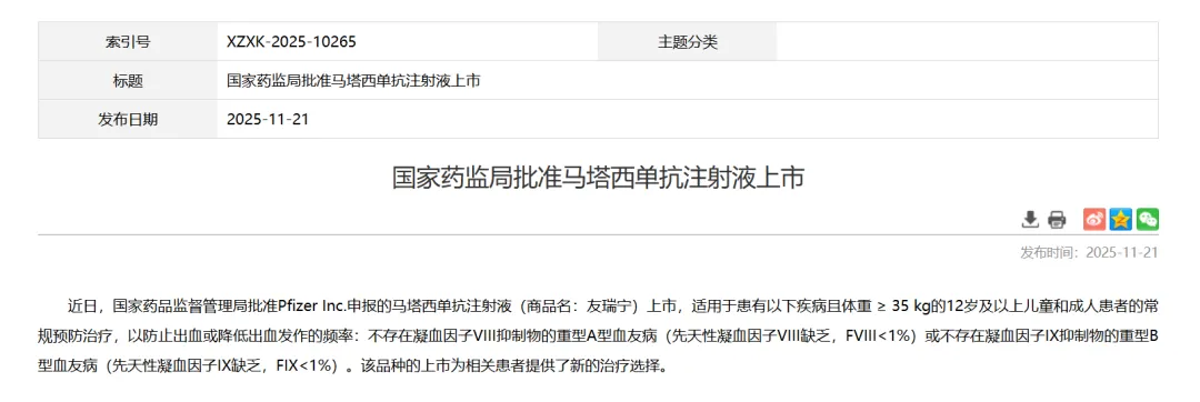 11月21日,NMPA官网显示,辉瑞的马塔西单抗(marstacimab)获批上市,用于常规预防重度血友病A或重度血友病B患者的出血。