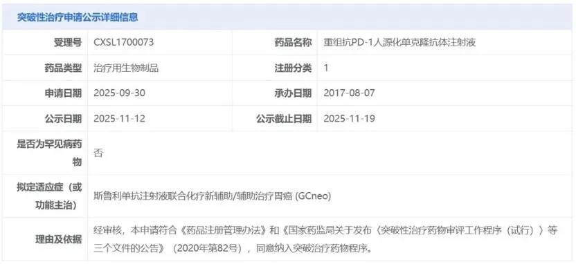 2025年11月20日,复宏汉霖(2696.HK)宣布,创新型PD-1抑制剂H药汉斯状®(斯鲁利单抗,欧洲商品名:Hetronifly®)被国家药品监督管理局(NMPA)药品审评中心(CDE)正式纳入突破性治疗品种名单,联合化疗用于新辅助/辅助治疗胃癌,成为首个获CDE突破性疗法认定的胃癌围手术期治疗药物。