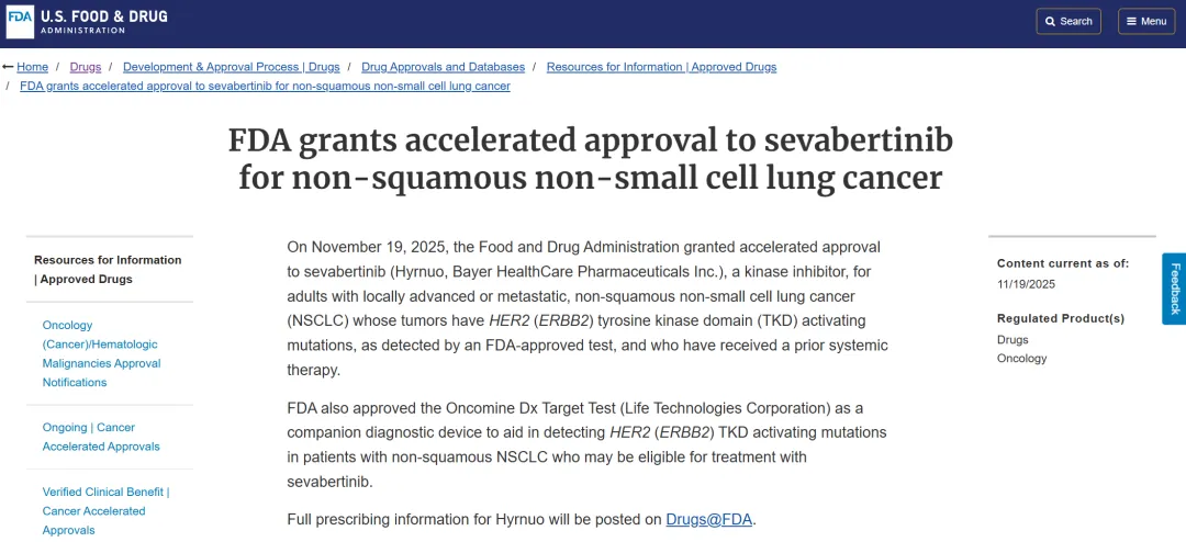 11月19日,美国食品药品监督管理局(FDA)宣布加速批准拜耳的小分子疗法Hyrnuo(sevabertinib),用于治疗经FDA批准的检测方法确认存在HER2(ERBB2)酪氨酸激酶结构域(TKD)激活突变、且已接受过至少一种全身治疗的成人局部晚期或转移性非鳞状非小细胞肺癌(NSCLC)患者。