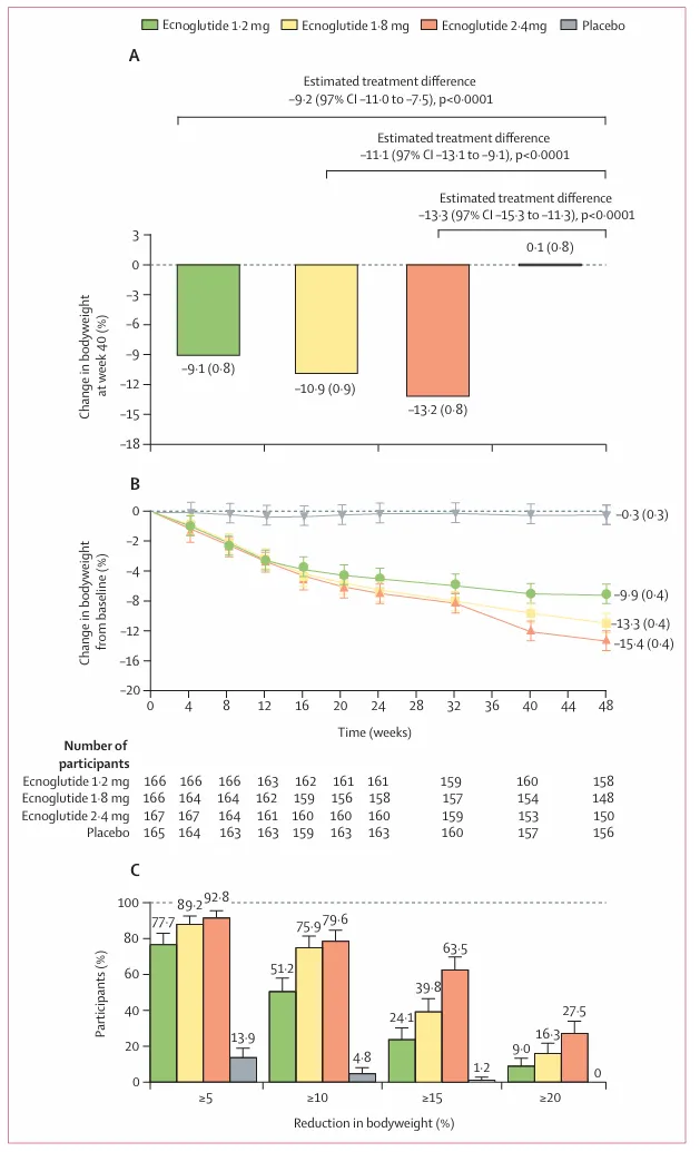 图示:埃诺格鲁肽减重效果(The Lancet Diabetes & Endocrinology,2025)