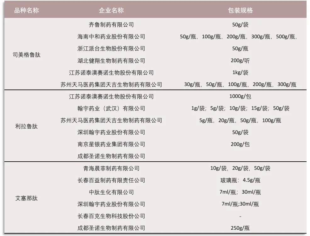 GLP-1 药物属于生物制品,生产工艺复杂,对发酵、纯化、制剂等环节的技术要求极高。诺和诺德与礼来已建立起全球领先的规模化生产体系,能够通过产能扩张降低单位成本,而国产企业多处于产能建设初期,在生产效率、质量控制稳定性等方面仍有差距。此外,核心原材料与生产设备的进口依赖,也可能导致国产药物在成本控制和供应链安全上面临风险,影响其在定价策略上的灵活性。截至2025年4月,CDE司美格鲁肽原料药登记数量为5家,利拉鲁肽为6家,艾塞那肽为6家。其中,诺泰生物、翰宇药业、圣诺生物主流原料药中2个品种均有登记。从包装规格看,诺泰生物量级最大,单规格达吨级,显示出规模化生产优势。预计利拉鲁肽专利到期利好以及司美格鲁肽2026 年专利保护期的临近,凭借在工艺优化与成本控制方面的突出优势,中国制药企业有望在未来潜在的GLP-1原料药市场中掌握主导权。