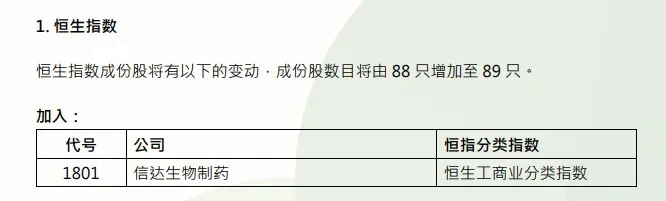 2025 年 11 月 24 日,信达生物宣布:根据恒生指数有限公司公布的2025 年三季度恒生指数系列季度检讨结果,信达生物(股票代码:01801.HK)成功入选恒生指数成份股,正式成为代表港股核心资产的蓝筹企业一员,这也是第一家从生物科技公司(biotech)成长为领先的创新生物制药企业(biopharma)并纳入恒生指数的公司。此外,信达生物同时入选恒生中国企业指数以及恒生ESG增强指数,多个核心指数同时纳入,其头部创新药企价值获国际资本市场高度认可。