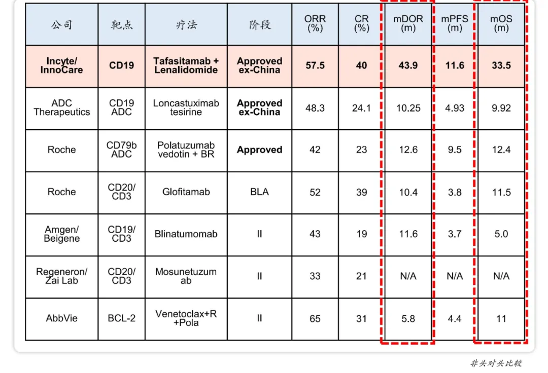 从临床应用来看,坦昔妥单抗相较于自体干细胞移植、CAR-T这两大r/r DLBCL主要二线治疗方案,价格和使用的便捷性都更具竞争力。而从疗效上看,坦昔妥单抗联合来那度胺治疗复发/难治DLBCL患者,mDOR达到43.9个月,mOS更达到33.5个月,显著高于在研的CD19 ADC、CD19/CD3双抗、BCL-2抑制剂等创新疗法,有潜力成为这一疾病领域的潜在最佳疗法。