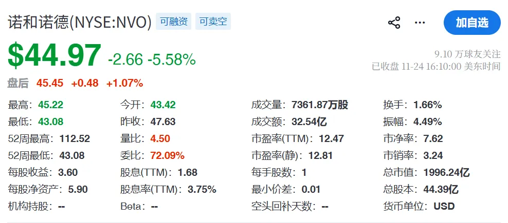 受此消息影响,诺和诺德美股当日收盘下跌近6%。
