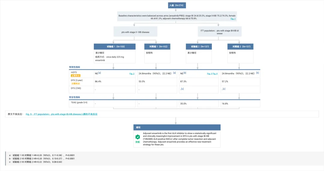结果显示,在 II-IIIB 期患者中,无病生存期(DFS)风险比(HR)为 0.20,其中恩沙替尼组患者 2 年 DFS 率达 86.4%,显著优于安慰剂组的 53.5%。在 ITT 人群中,DFS 风险比为 0.20 ,恩沙替尼组的 2 年 DFS 率为 87.3%,安慰剂组为 57.2%。