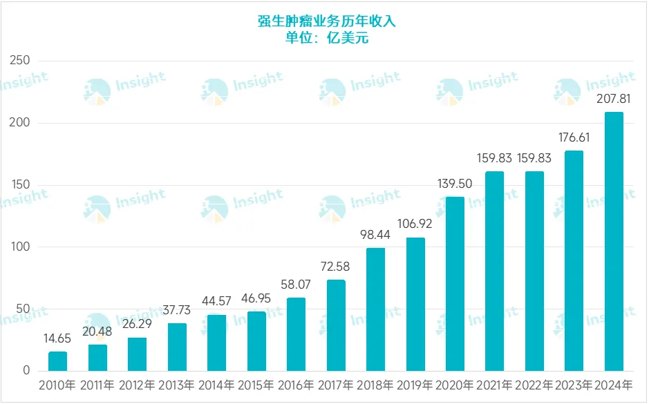早在十多年前,强生就开始切入肿瘤领域,并通过并购公司或者从外部引进产品,一步一步打造了丰富的肿瘤管线。2024 年,强生肿瘤业务收入 207.81 亿美元,首度超越自免,成为其创新药收入的第一大来源。2025 年前三季度,强生肿瘤业务继续保持 21.2% 的高速增长,创收 185.19 亿美元,按照这个增速预测,今年收入将再创新高。