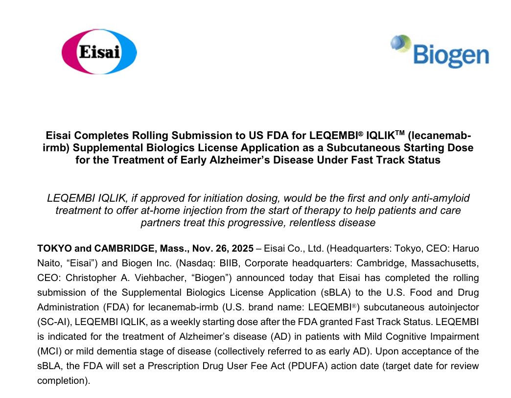 11月26日,卫材(Eisai)和渤健(Biogen)宣布,已完成向美国FDA滚动递交Leqembi Iqlik(lecanemab)皮下注射自动给药装置(SC-AI)作为起始给药方案用以治疗早期阿尔茨海默病(AD)患者的补充生物制品许可申请(sBLA)。此前,该产品已获FDA授予快速通道资格。本次sBLA的递交主要基于一系列评估Leqembi Iqlik皮下注射给药方案的数据,包括在3期Clarity AD研究18个月核心试验结束后、在其开放标签延长期(OLE)中开展的多个亚研究,入组对象为早期AD患者。