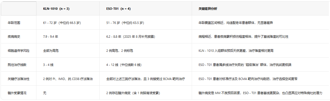 KLN-1010起效更均衡,ESO-T01擅解复杂病灶。KLN-1010实现100% MRD阴性率,起效一致性突出,适配无髓外病变的高危 RRMM患者;ESO-T01虽MRD阴性率为75%,但取得多项突破性疗效 ——4例患者均实现客观缓解,其中2例达严格意义完全缓解、1例达非常好的部分缓解,更关键的是其成功实现2例髓外病变(含脑脊液受累)患者病灶完全消退,而这类病灶正是传统CAR-T 疗法的治疗难点。此外,ESO-T01 对复发患者的二次给药也能实现缓解,验证了其在复发病例中的应用价值。