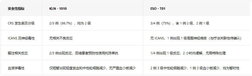整体来看,两款疗法均无重度、持续性血液毒性,KLN-1010的预防用药方案为临床提供了可借鉴的安全管理经验,ESO-T01则以更低的输注相关反应发生率展现出良好的安全性基础。