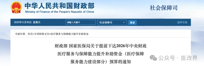11月27日,财政部发布《财政部国家医保局关于提前下达2026年中央财政医疗服务与保障能力提升补助资金(医疗保障服务能力建设部分)预算的通知》《财政部国家医保局关于提前下达2026年中央财政医疗救助补助资金(城乡医疗救助部分)预算的通知》《财政部国家医保局关于提前下达2026年中央财政城乡居民基本医疗保险补助》。