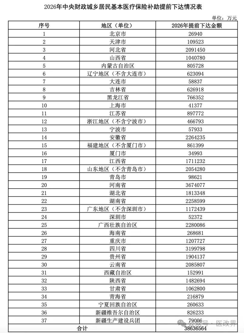 据统计,本次提前下达金额共计约4165.57亿元,其中2026年中央财政城乡居民基本医疗保险补助提前下达约3863.66亿元,提前下达2026年中央财政医疗救助补助资金(城乡医疗救助部分)预算266.86亿元,提前下达2026年中央财政医疗服务与保障能力提升补助资金(医疗保障服务能力建设部分)35.05亿元。