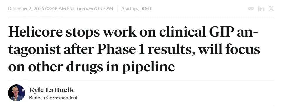 12月2日,专注于发现和开发用于治疗肥胖症和相关疾病的同类首创葡萄糖依赖性胰岛素促泌肽 (GIP) 拮抗剂的生物制药公司Helicore Biopharma宣布,终止了其GIP拮抗剂HCR-188的临床试验,并计划将重点转向其研发管线中的其他肥胖症候选药物。