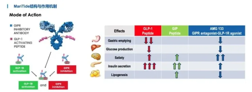 MariTide(AMG133)是一种创新型长效肽-抗体偶联物,其为特异性GLP-1R激动剂和GIPR拮抗剂。通过促进胰岛素分泌、抑制食欲、延缓胃排空等途径,显著降低体重和改善血糖控制。另外,通过抑制GIPR信号,减少GIP对胰岛素分泌的增强效应,同时增强GLP-1激动的代谢改善能力。