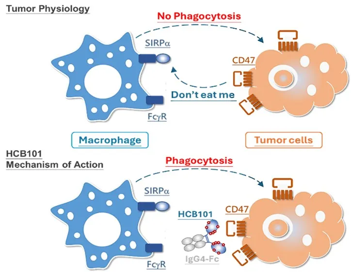HCB101 与肿瘤 CD47 结合、封锁“别吃我”信号,通过工程化 IgG4 Fc 触发巨噬细胞吞噬,同时避免与红细胞结合