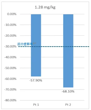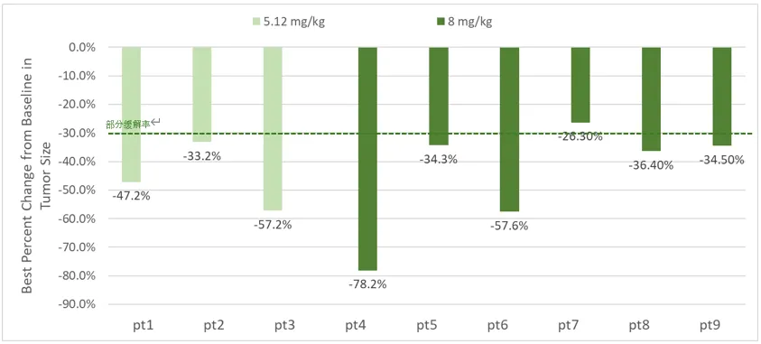 中剂量队列十名患者中九名患者均出现持续的肿瘤缩小,最大缩小幅度达-78.2%
