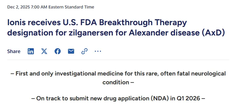 2025年12月3日,Ionis Pharmaceuticals宣布,美国 FDA 已授予其在研反义寡核苷酸(ASO)疗法 zilganersen(ION373)突破性疗法认定,用于治疗亚历山大病(AxD)。